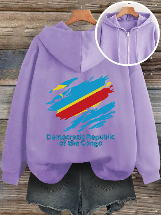 Women'S Casual Hooded Zip-Up Cardigan with Democratic Republic of the Congo Print, Loose Fit Fashion Top for Fall/Winter, Front Pocket Detail, Hoodie