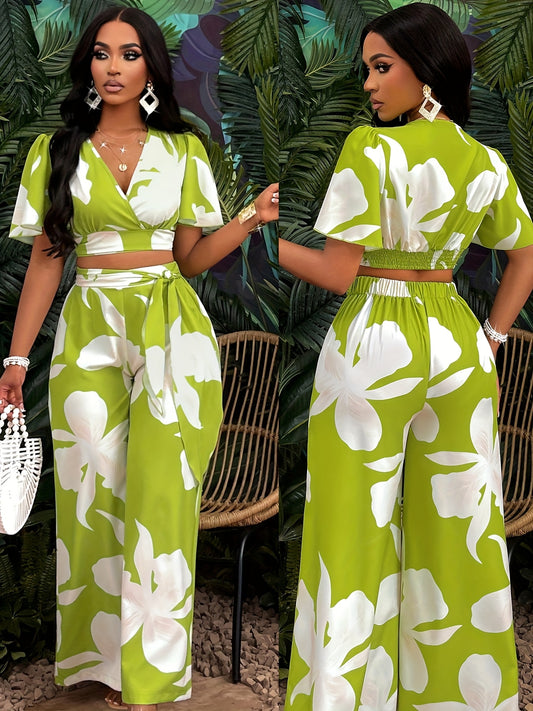 Lencensa - Ensemble Femme Crop Top Tropical et Pantalon Large