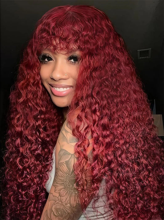 Perruque bouclée bordeaux 99J avec frange, cheveux naturels ondulés profonds, couleur sans colle, perruque brésilienne entièrement faite à la Machine pour femmes