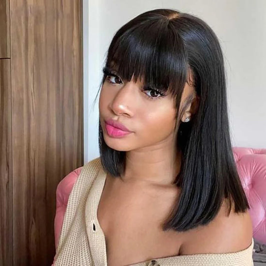 Perruque Bob Lace Front Wig naturelle péruvienne, cheveux courts et lisses, avec frange, cheveux Remy brésiliens, partie facile, pour femmes