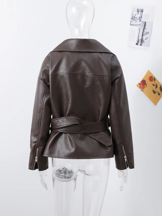 Veste Femme en Cuir Marron avec Ceinture - Style Motard Automne